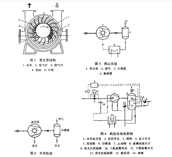 圖2所示的流程稱為開式機組,由水環真空泵及(氣水)分離器組成。工作水直接注入到真空泵,氣、水混合物一起排到分離器,氣體由上面排出,水從下面排走。開式機組一次性投資較小,但由于其可提供的自動化程度不高,而且需要用到大量的工作水,只能采用一般的循環用水,(而不能采用水質較好凝結水)。因而只有極個別的電廠采用,在其他行業多數是采用這種形式的。 2.流程2