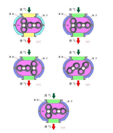 如圖為羅茨泵轉子由0°轉到180°的抽氣過程。在0°位置時(圖中a),下轉子從泵入口封入v0體積的氣體。當轉到45°位置時(圖中b),該腔與排氣口相通。由于排氣側壓強較高,引起一部分氣體返沖過來。當轉到90°位置時(圖中c),下轉子封入的氣體,連同返沖的氣體一起排向泵外。這時,上轉子也從泵入口封入v0體積的氣體。當轉子繼續(xù)轉到135°時(圖中d),上轉子封入的氣體與排氣口相通,重復上述過程。180°(圖e)位置和0°位置是一樣的。轉子主軸旋轉一周共排出四個v0體積的氣體。